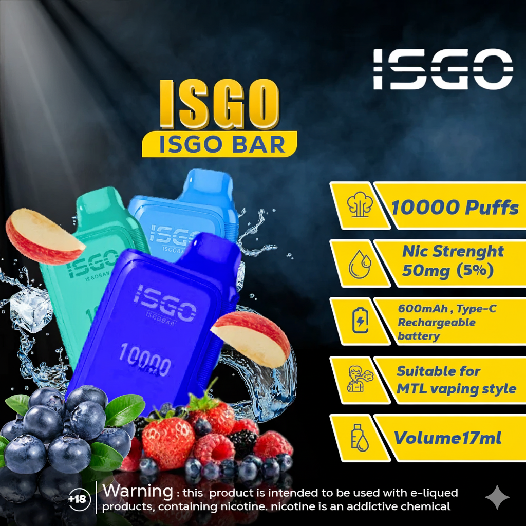 إيسغو بار (ISGO BAR) - 10000 سحبة (Puffs) فيب (Vape) للاستخدام مرة واحدة
